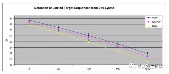 隨著HeLa細胞數的增加,分別用適量細胞裂解液裂解細胞后進行反轉錄,而后在7700 PCR儀上進行Actin、GAPDH和B2M基因的3復孔qPCR反應。