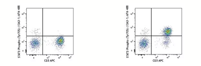 在蛋白翻譯后修飾(磷酸化、乙酰化、甲基化等)的研究過程中,固定劑不僅可以有效的“固定”住翻譯后修飾的位點(絲氨酸、蘇氨酸、酪氨酸等),也可以防止目標位點在活細胞中很快降解(比如磷酸酶會去除磷酸化修飾、去甲基化酶會移除甲基化修飾等)。下面的例子是用IL-6的重組蛋白刺激人外周血15分鐘后看STAT3705位酪氨酸的磷酸化水平,在刺激完樣本后就需要通過固定來實現目的氨基酸磷酸化水平“停留”在IL-6刺激15分鐘這個節點上。