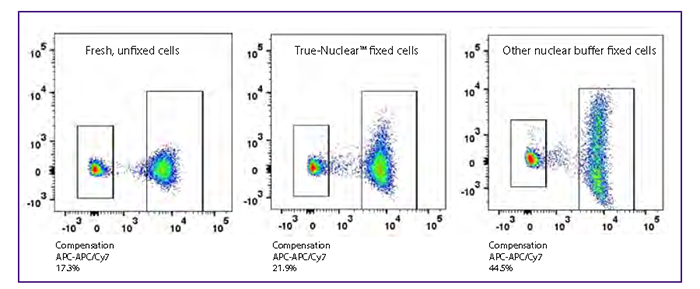 主要表現在固定劑對串聯染料(tandem-dye,如APC/Cy7PE/Cy7等)的影響:一個是固定劑有可能造成串聯染料的斷裂,比如APC-Cy74%多聚甲醛溶液接觸時間超過4個小時染料就有可能斷裂,所以如果細胞直接重懸在固定液里面建議盡快上機,如果要放到第二天上機,需離心去除固定液后重懸在流式染色液或者是PBS里面,當然有一些新的串聯熒光素可以有效減少這種情況,比如BioLegendAPC/Fire750TM染料。