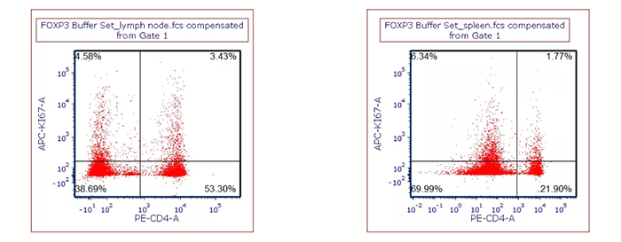 BioLegend FOXP3 Buffer set對細胞進行固定破膜處理后,染Ki-67抗體,左圖:小鼠淋巴結樣本;右圖:小鼠脾臟樣本。