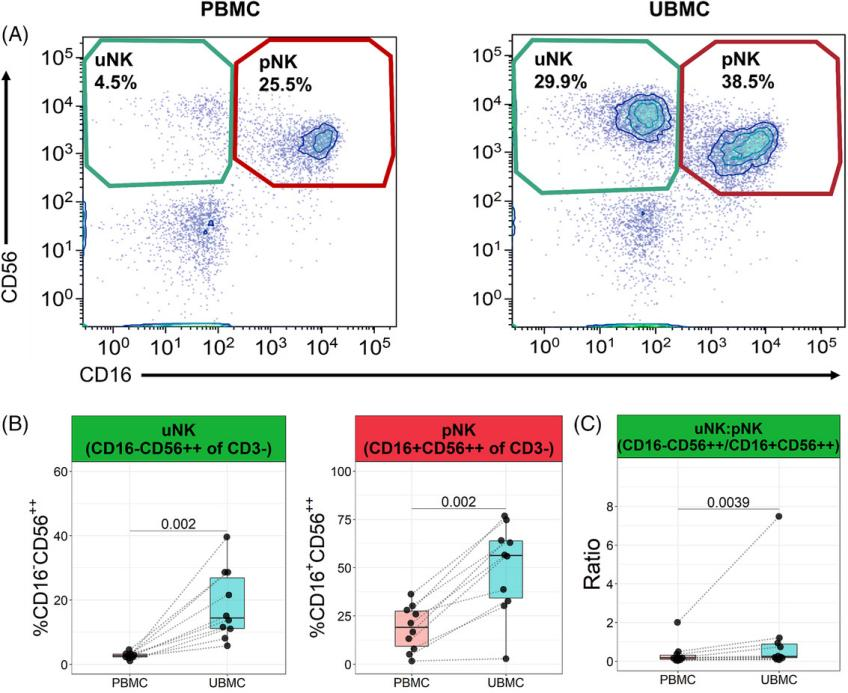 Kahn等人采用了一種從胎盤床收集白細胞的技術,即在剖腹產后使用手術海綿擦拭子宮腔。這種方法通常用于確保胎盤從子宮腔中完全并清除多余血液,因此不會給患者帶來額外的風險。本文用這種方法分析胎盤床NK細胞、T細胞、B細胞和單核細胞的表型,并與外周血樣本中對應細胞進行比較。